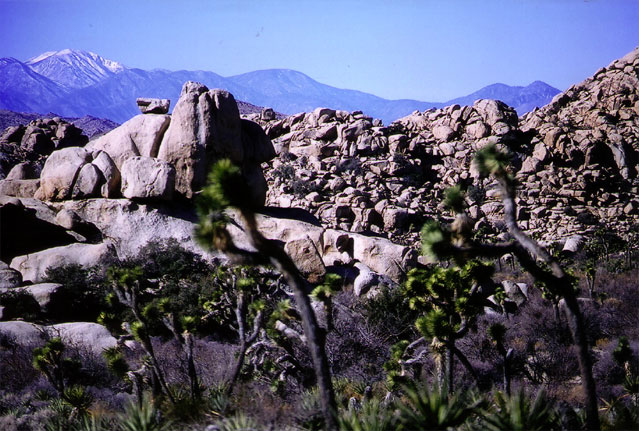 ジョシュアツリーと大きな岩がボコボコした風景が特徴。