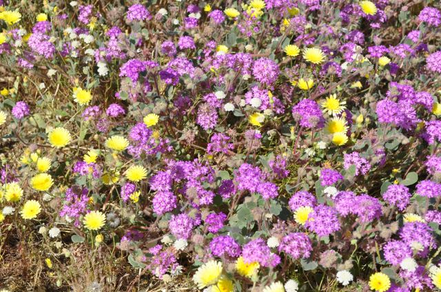 砂漠ひまわりと呼ばれる黄色の花と、サンドバーベナと言うピンク紫の花が一面に咲き乱れる。