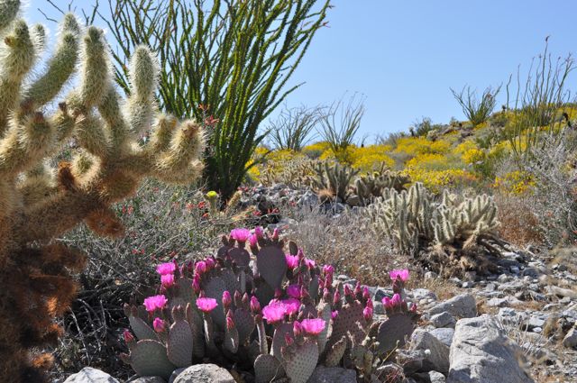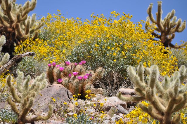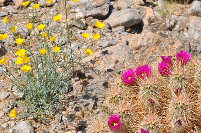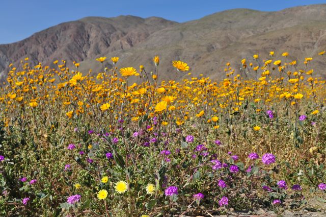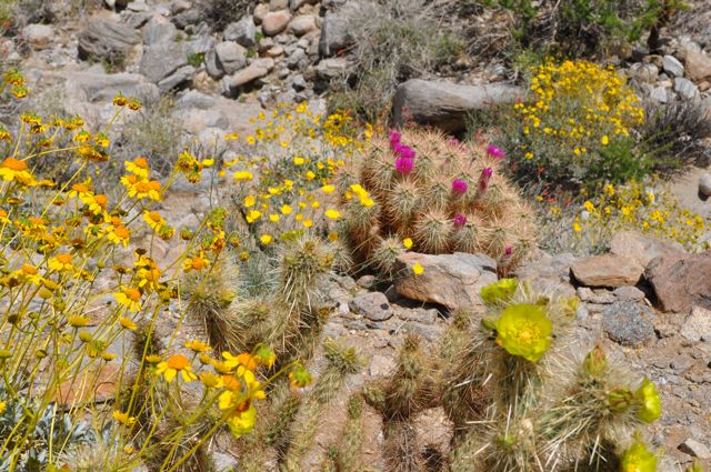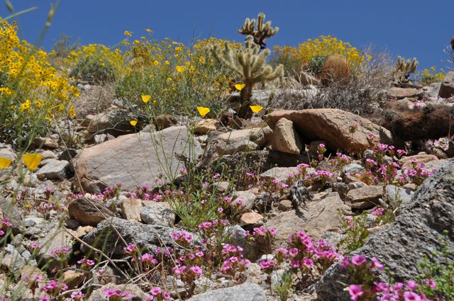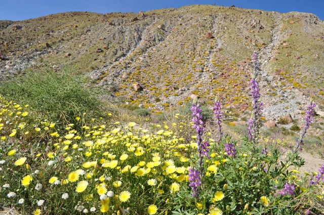 下の地面や岩間には、黄色の砂漠タンポポや砂漠ポピー、紫の砂漠ルーパインなどが咲く。